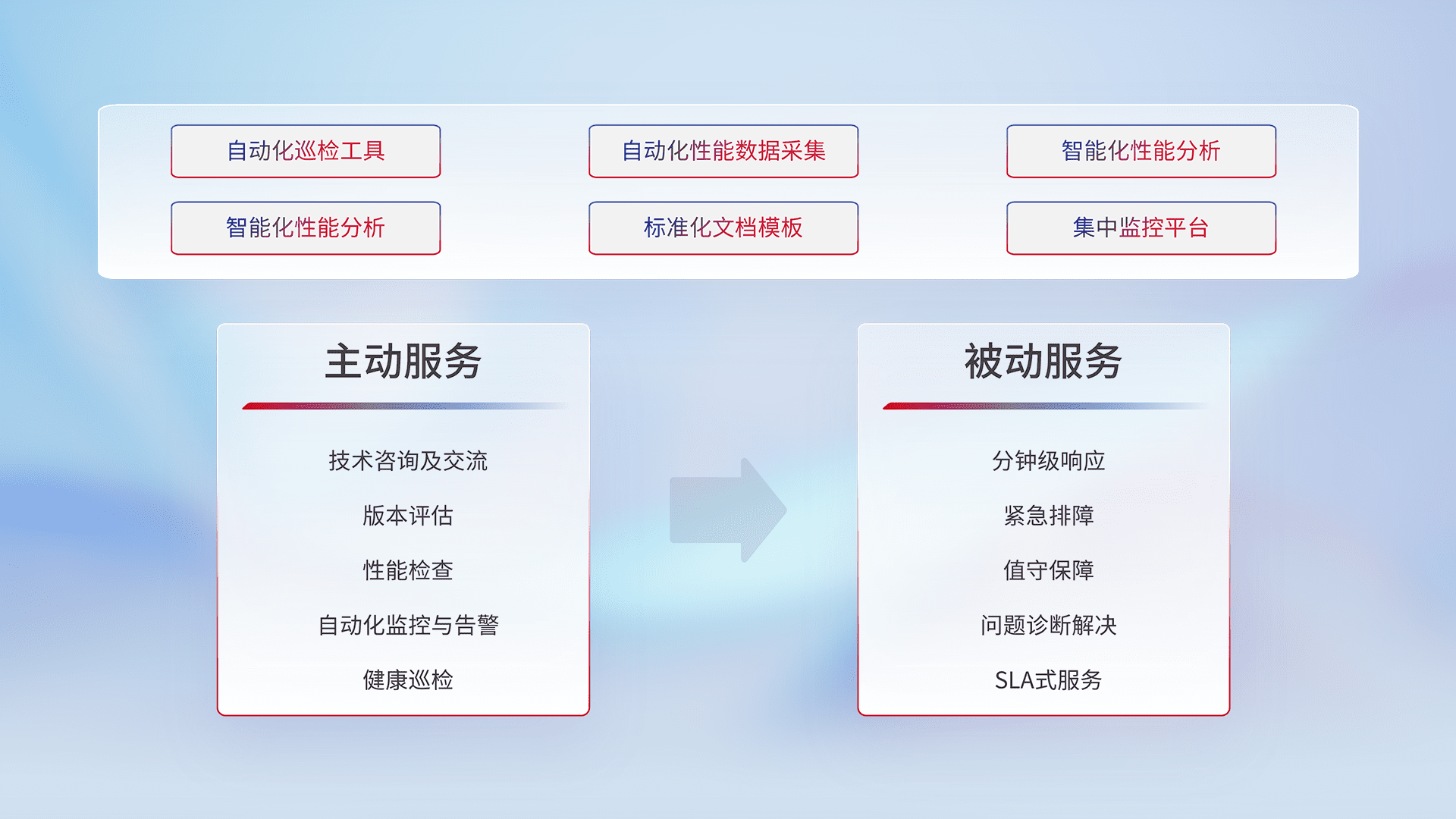 智能化工具和标准化文档,,,保障服务质量,,,提供主动服务(包含技术咨询、、、版本评估、、、、性能检查、、、、自动化监控与告警、、、健康巡检)和被动服务包含(分钟级响应、、紧急排障、、、、值守保障、、、问题诊断解决、、、SLA服务)。。。